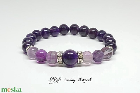 Ásvány neve, mérete: fluorit 6 db. 8 mm-es, ametiszt 1 db. 10 mm-es és 14 db. 8 mm-es