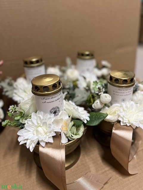 - Anyaga: élethű selyemvirág, szatén szalag, gyertya, üveg