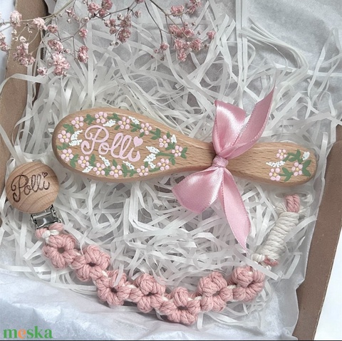 Babaváró ajándékcsomag kézzel festett babafésűvel és gravírozott makramé cumilánccal