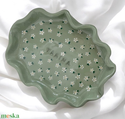 Egyedi névvel kérhető kézzel festett zöld virágos ajándék tálka nőknek, ékszertartó, dísztál