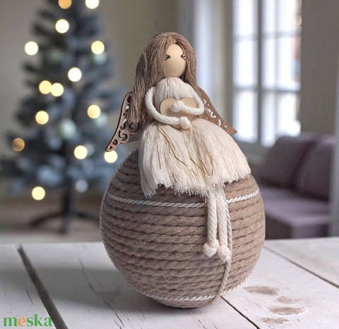 Makramé angyal karácsonyfadísz natúr színekben – fa szárnnyal és ünnepi csillogással