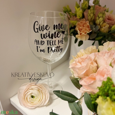 Give me wine and tell me I'm pretty, feliratos boros pohár, vicces feliratos pohár, nőnapi feliratos - otthon & életmód - konyhafelszerelés, tálalás - tálalás - boros poharak, szettek - Meska.hu