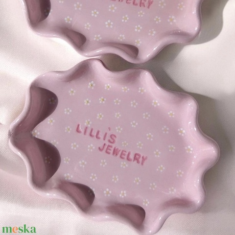 Rózsaszín kézzel formázott virágmintás ékszertartó tálka, egyedi névvel, trendi ajándék nőknek