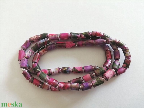 újrahasznosított papír, ragasztó, ékszerlakk, filctoll, akrilgyöngy, gumis damil