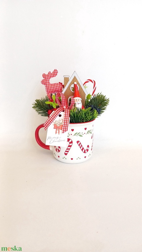 - Anyaga: tűzőhab, műnövények, műbogyók, kaspó, szalag, mikulásdekor, karácsonyidekorációk, kártya