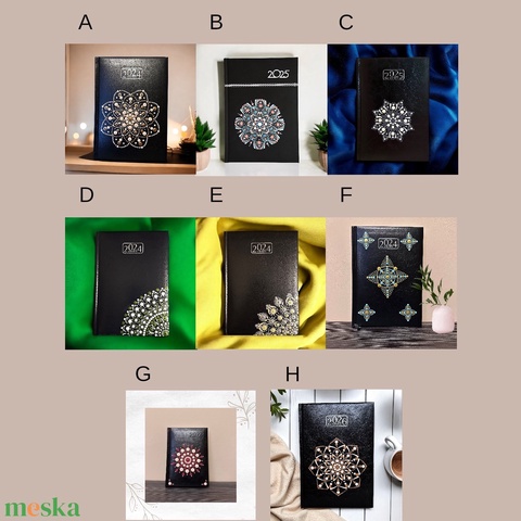 3. Milyen pontmandala minta, stílus tetszik? Inspirációként a fotók közt korábbi munkáim közt nézelődhetsz. Az első fotón fekete napi naplókat, a másodikon színes napi és heti naplókat, míg a harmadikon zsebnaptárakra festett pontmandalákat láthatsz. Választhatsz egy konkrét mintát, de egyedi kérésed is lehet.
