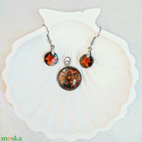Őszi Éj Parázs – Narancssárga Virágos Műgyanta/Kaboson Ékszerszett, Fekete Alapon