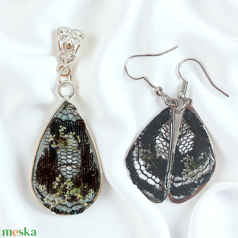 Fekete Csipkés Műgyanta Ékszerszett Fehér Virággal, Elegáns V-forma