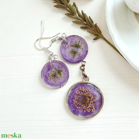 Ametiszt Est – Lila Gyöngyös Műgyanta Ékszerszett Fehér Virágokkal, Kerek Forma