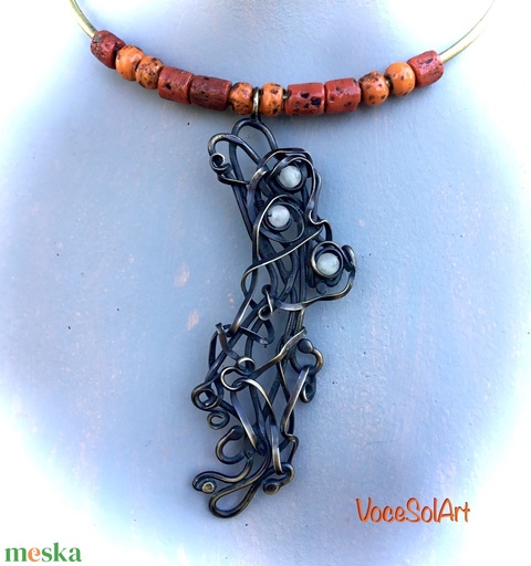 fém nyakpánt, féldrágakő, sárgaréz, kerámia gyöngyök