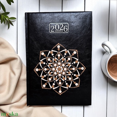 2026. évi fekete műbőr A/5 napi határidőnapló szatén fényű barna és matt barack színű pontmandalával 21x14,8 cm
