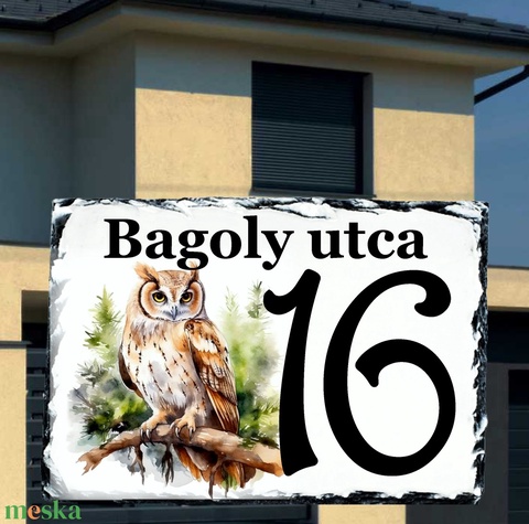 Egyedi festett házszámtábla bagoly mintával