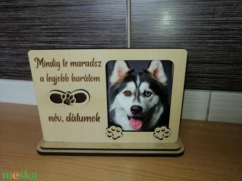Elhúnyt kis kedvencednek állithatsz emléket ezzel a fotókerettel amely lézervágással és gravírozással készült. A fotó helyének mérete kompatibilis az egyik nagy drogéria láncban található fotó kidolgozó autómata kép méreteivel.