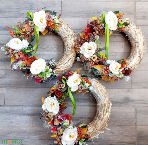 - Anyaga: szalma alap, termések, szatén szalag, ragasztó, madzag, barackmag, gesztenye, makk, dió