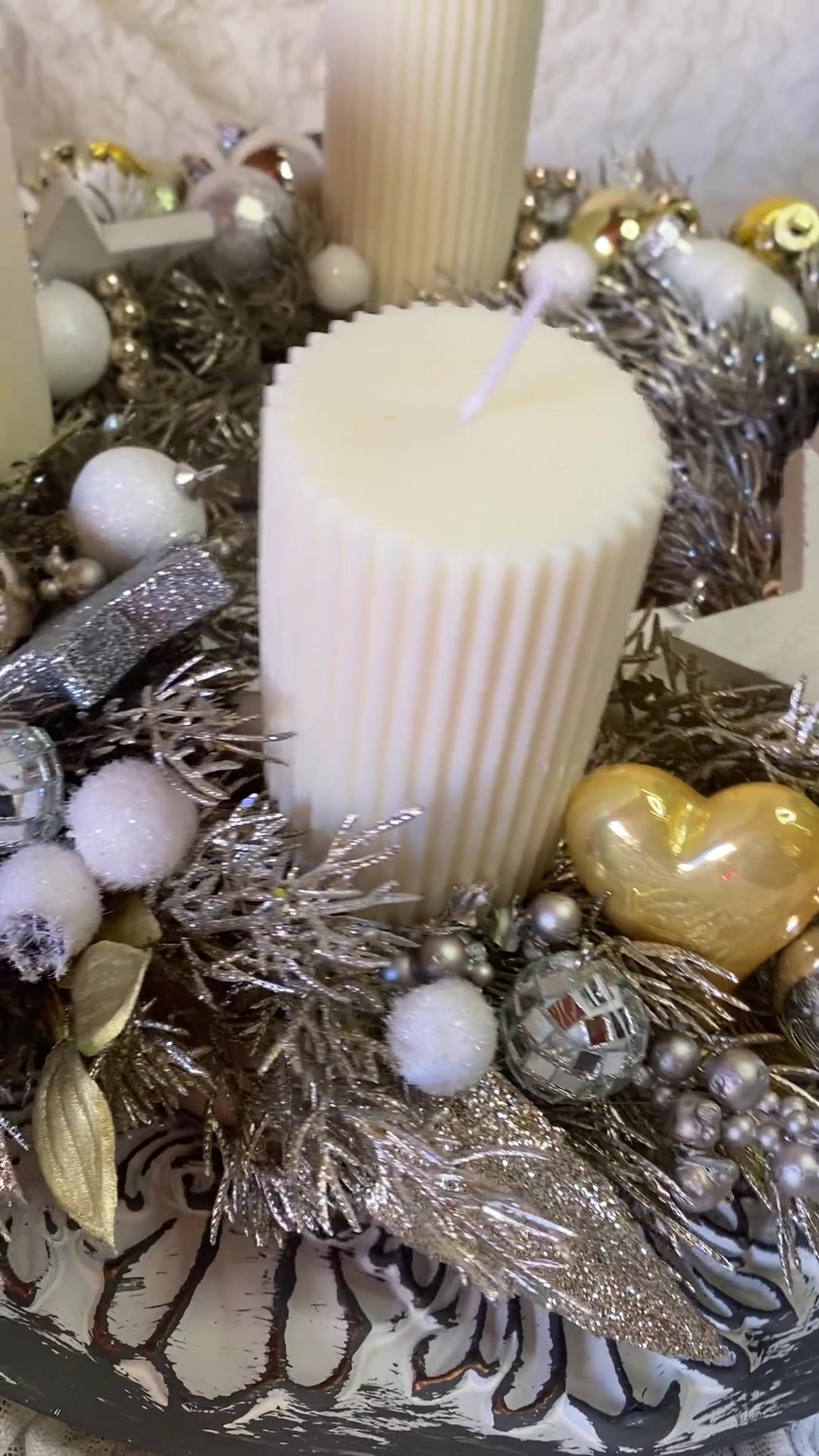 - Anyaga: műanyag díszek, mű arany fenyőágak, gyertya