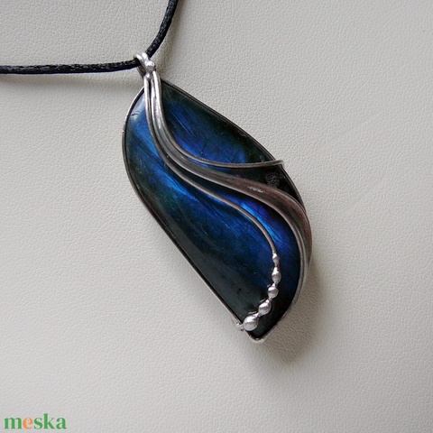 A medál Tiffany technikával készült labradorit és ólommentes, ezüsttartalmú ón felhasználásával. A díszítés szintén saját készítésű, nem tartalmaz gyári elemeket. A fémrészt óezüstre patináztam, lekezeltem antioxidánsal és lelakkoztam, hogy sokáig szép maradjon.
