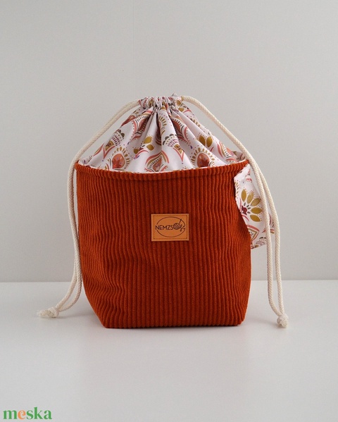 Közepes méretű behúzós projekt táska kézimunkához (sötét narancs kordbársony)