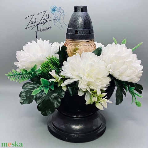 Fehér Krizantém Mécses kompozíció – Zöld Levél Díszítéssel