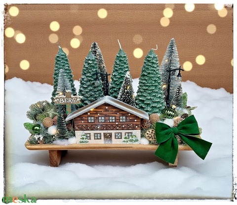 - Anyaga: gyertya, műnövény, üveggömbök, fa házikó, fa tálca