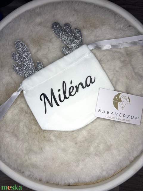 Névre szóló, kis méretű Mikulás zsák, csillogós agancsal