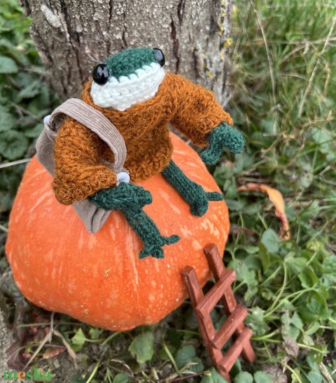 Kézzel kötött kis béka – 13 cm, gyapjú pulóverben és bársony alsóban