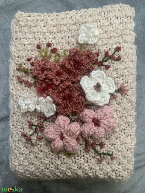 KönyvBorító Kézi kötésű bírsz színű Könyvborító horgolt virágokkal díszítve