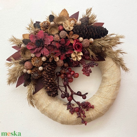 - Anyaga: koszorú alap, szárazvirág, toboz, selyemvirág, szalag