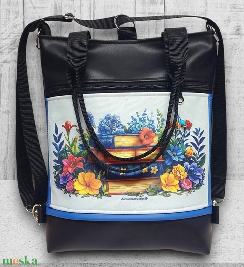 Virágzó könyvek 4in1 hátizsák univerzális táska fekete alapon kék díszítéssel