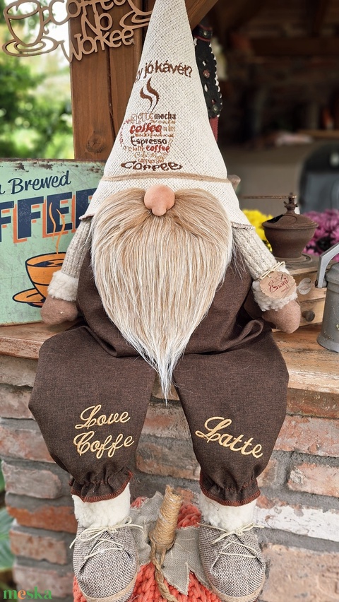 - Anyaga: pamutvászonkockás szövet, töltőanyag, kárpit textil, juta madzag, fából készült gomb, manószakáll