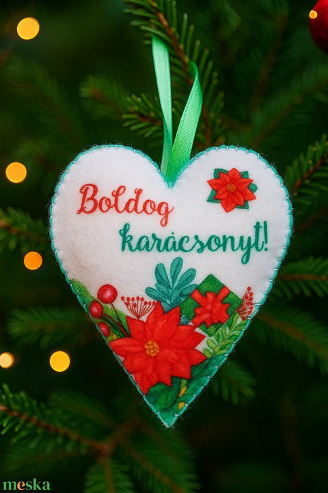 Virágos karácsonyfadísz Boldog Karácsonyt felirattal barkácsfilcből