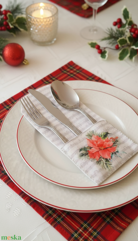 Karácsonyi evőeszköz tartó lány vagy fiú angyalkás, romantikus virágos mintával barkácsfilcből