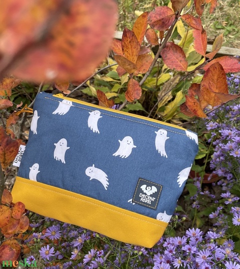 Kísértet mintás pipere táska sárga szövettel, sárga cipzárral, füllel