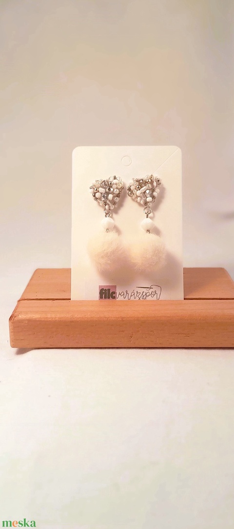- Anyaga: filc, üveggyöngy, antiallergén fém szerelék, szilikon hátoldal, himzőcérna, pom-pom