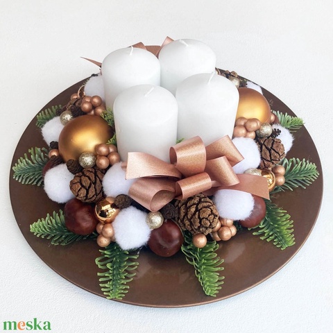 tál, gömbök, toboz, termések, gyertya, műfenyő, szalag