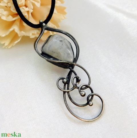 A medál Tiffany technikával készült szivárvány holdkő kaboson, réz és ólommentes, ezüsttartalmú ón felhasználásával. A díszítés szintén saját készítésű, nem tartalmaz gyári elemeket. A fémrészt óezüstre patináztam és lelakkoztam, hogy sokáig szép maradjon.