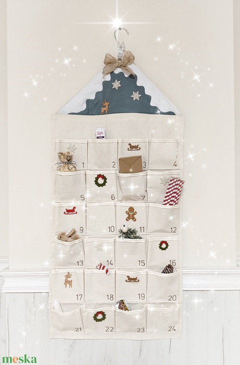 105x47 cm-es ház alakú adventi naptárt varrtam. Natúr vászon anyagnak látszik, de valójában vastagabb, vizlepergetős, hátulján "müanyag" borítású terítő anyagot használtam, sokkal jobb a tartása. Havas tetőt kapott és bájos karácsonyi motívumok kerültek filcből a zsebekre. A számokat sablonnal, textilfilccel rögzítettem. A zsebekbe kerülhet csokoládé, szájfény, matrica, pixel hobby kulcstartó készítő szett, lufi, hajgumi, csat, gyöngyök, stb., de szerintem lehet kinyomtatott karácsonyi mesét összehajtva bele tenni, vagy belépő, teafű, barkácsoláshoz ötlet, ígéret egy karácsonyi vásár látogatására, mézeskalács fűszer együtt sütéshez, sőt nekem nagyon tetszik egy szép 24 darabos kirakó, téli témával, szentestére össze áll a kép, vagy egy 24 darabos memória, már csak 1-1 szem cukor vagy csokigolyó kell és megtelt a naptár!