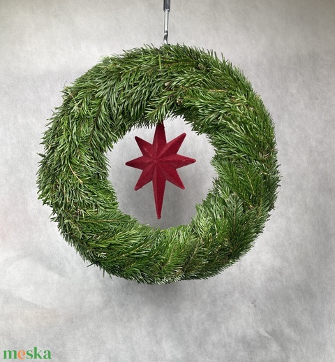 44 cm átmérőjű alapra készült, bordó flokkolt csillagos, Nordmann fenyős, tovább is díszíthető koszorú (NK-13)