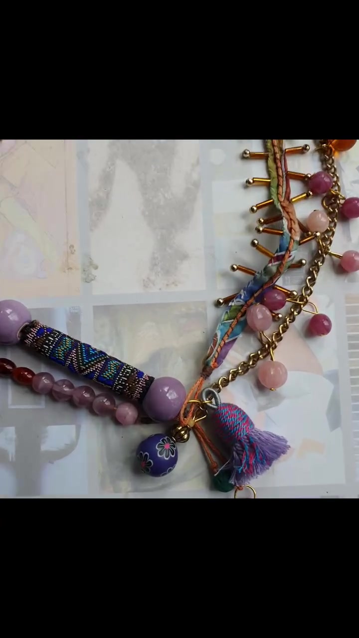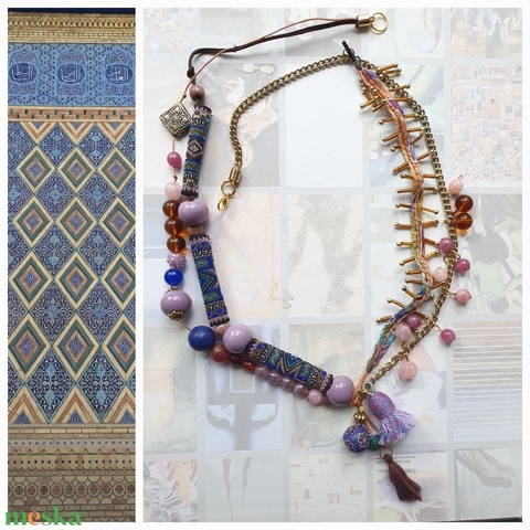 arany szinű lánc és szerelékek, zsinórok, üveg gyöngyök, kerámia gyöngyök, bojtok, textil hengerek