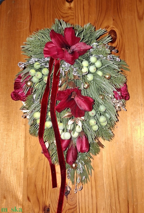 - Anyaga: műfenyő, bordó szalag, bordó virágok, tűzőhab, műmagyal, akril, tűzők, arany színű levelek