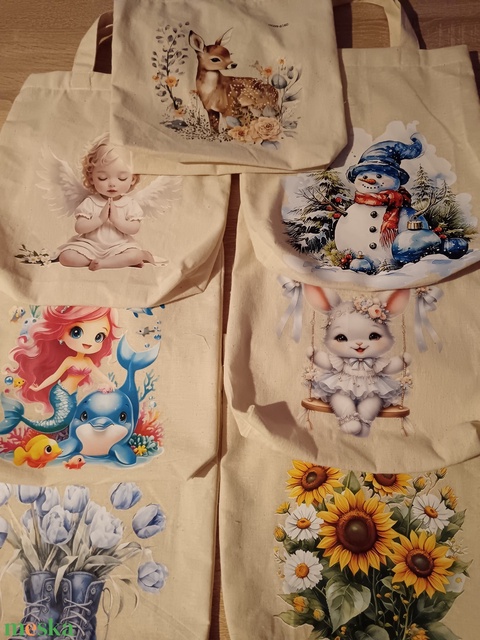 Kis táskák. 28x31 cm. Elején rávasalt motívummal. Akár más mintával is, megbeszélés szerint. Van készleten is, de megrendelésre is elkészítem.