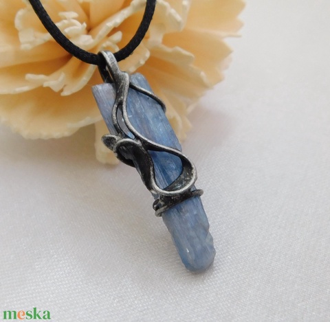A medál Tiffany technikával készült gyönyörű nyers kianit (disztén), réz és ólommentes, ezüsttartalmú ón felhasználásával. A díszítés szintén saját készítésű, nem tartalmaz gyári elemeket. A fémrészt óezüstre patináztam és lelakkoztam, hogy sokáig szép maradjon.