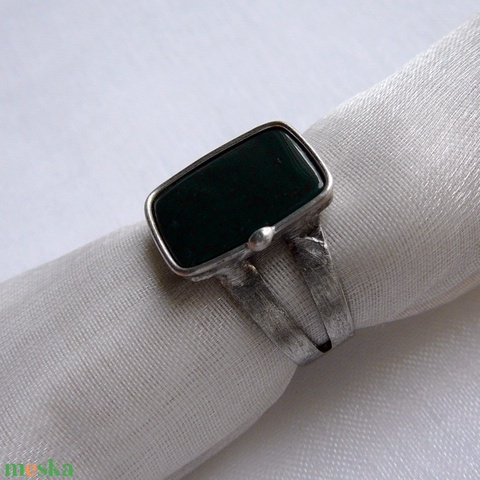 A gyűrű Tiffany technikával készült heliotróp és ólommentes, ezüsttartalmú ón felhasználásával. A díszítés szintén saját készítésű, nem tartalmaz gyári elemeket. A fémrészt óezüstre patináztam és lelakoztam, hogy sokáig szép maradjon.