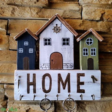 Home felirattal díszített fa fali kulcstartó színes házikókkal