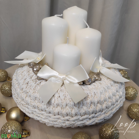 Kézzel horgolt adventi koszorú - csillogó fehér alap