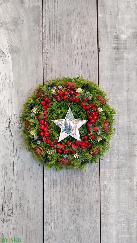 - Anyaga: műzöldek, műbogyók, szalag, műzöldalap, fémcsillagdekor, termések