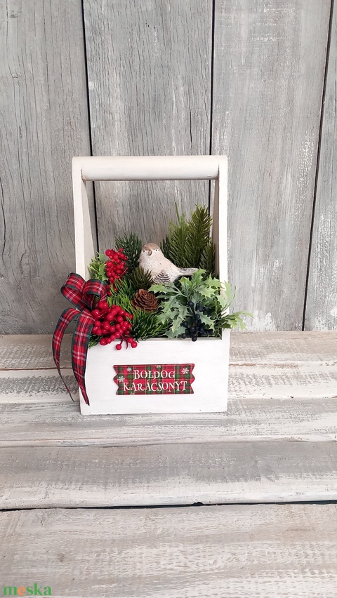 - Anyaga: tűzőhab, műnövények, műbogyók, szalag, faláda, kismadárdekor