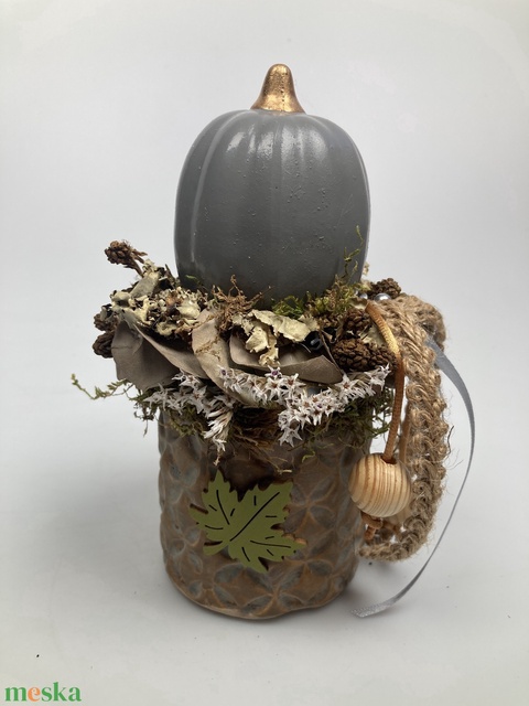 Földszínekben pompázó, kerámiakaspós, fehér sóvirágos tartós virágdísz szürke kerámiatökkel és zöld falevél feltéttel