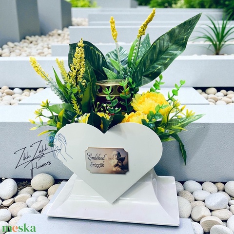 Fehér Szív Mécses kompozíció – Sárga Krizantémokkal