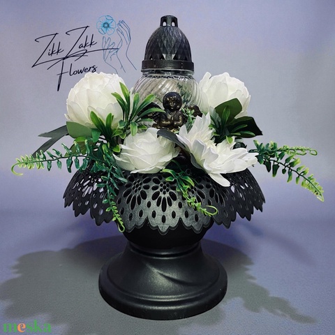 Fekete Angyalos Mécses kompozíció – Fehér Virágokkal