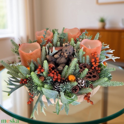 Mackós adventi asztaldísz – fahéjas rezes ünnepi színekben
